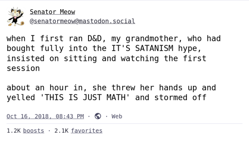 arrow-up11arrow-down1imageSatanic Mathplus-squarepawb.socialThefuzzyFurryComrade@pawb.social to RPGMemes @ttrpg.network · 8 months agomessage-square0linkfedilink